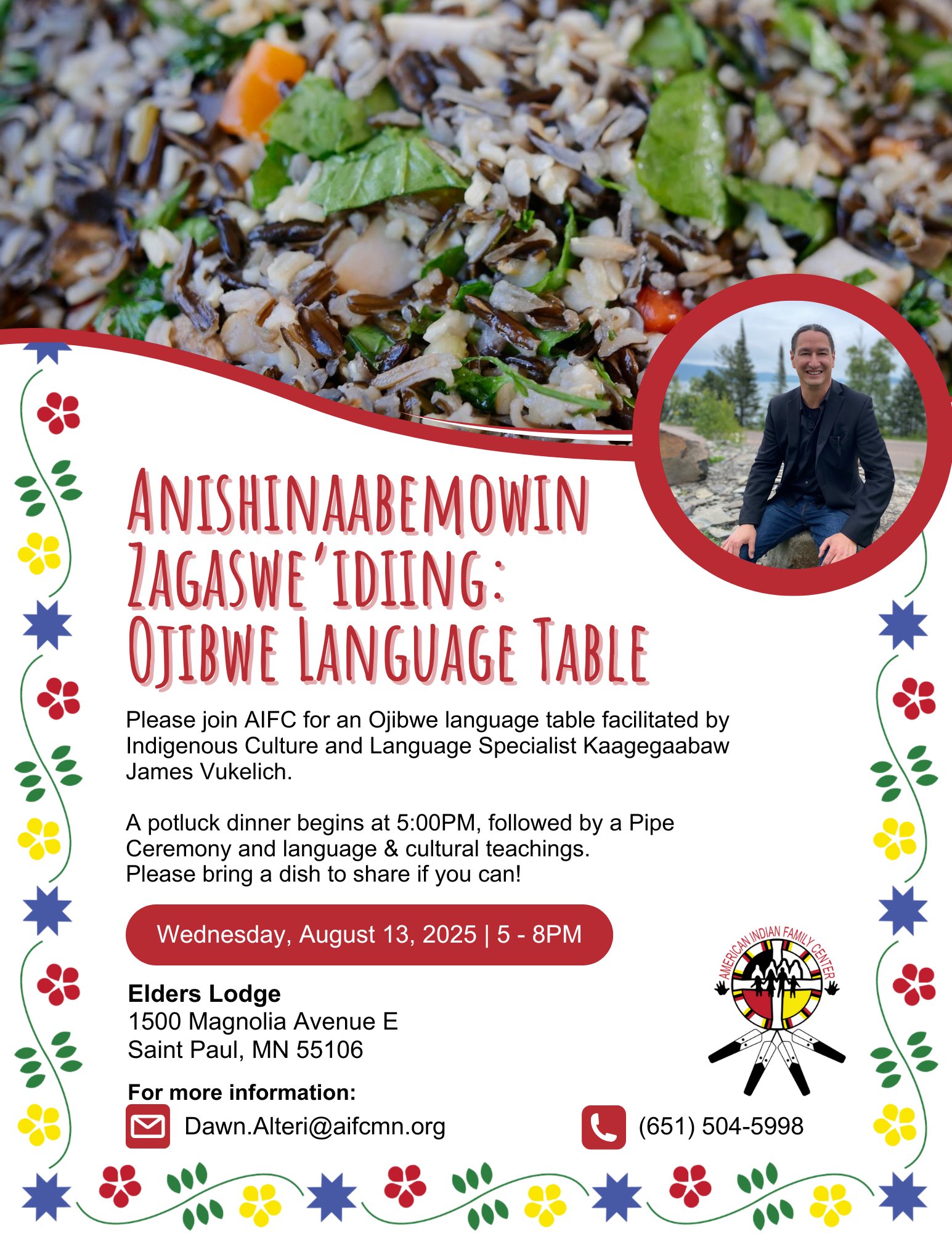 Elders Lodge 1500 Magnolia Ave E, Saint Paul, MN, United StatesPlease join us for an Ojibwe language table facilitated by Indigenous Culture and Language Specialist Kaagegaabaw James Vukelich on Wednesday, November 19, 2025. A potluck dinner begins at 5:00PM, followed by a Pipe Ceremony and language & cultural teachings. Please bring a dish to share if you can! Location: Elders Lodge (1500 Magnolia Avenue East, […]